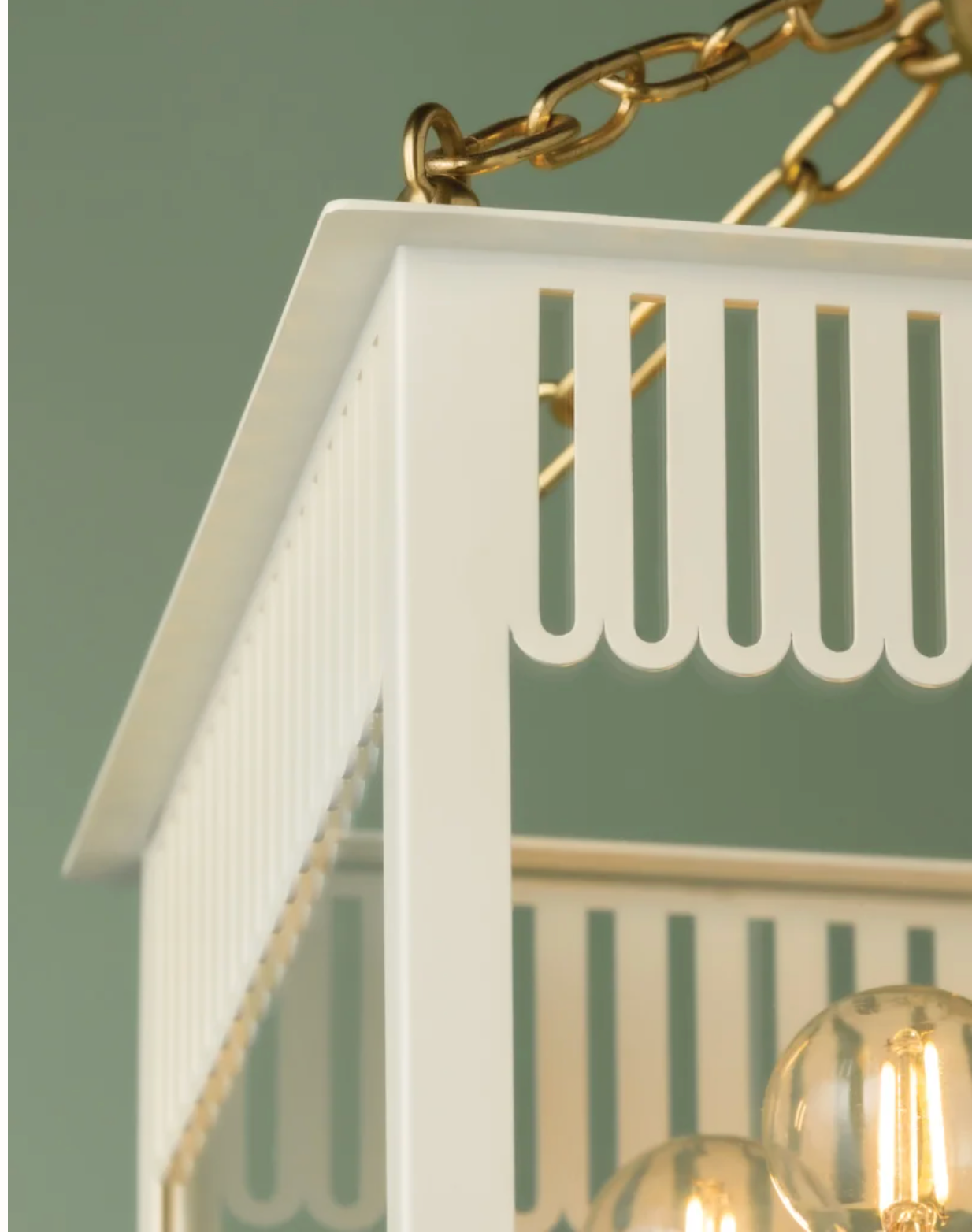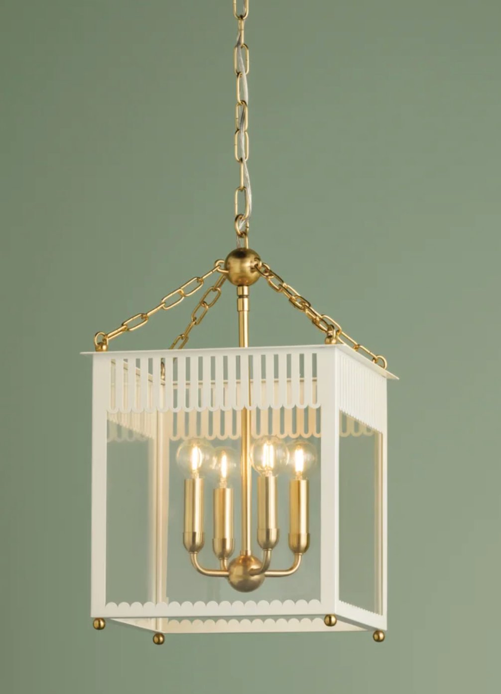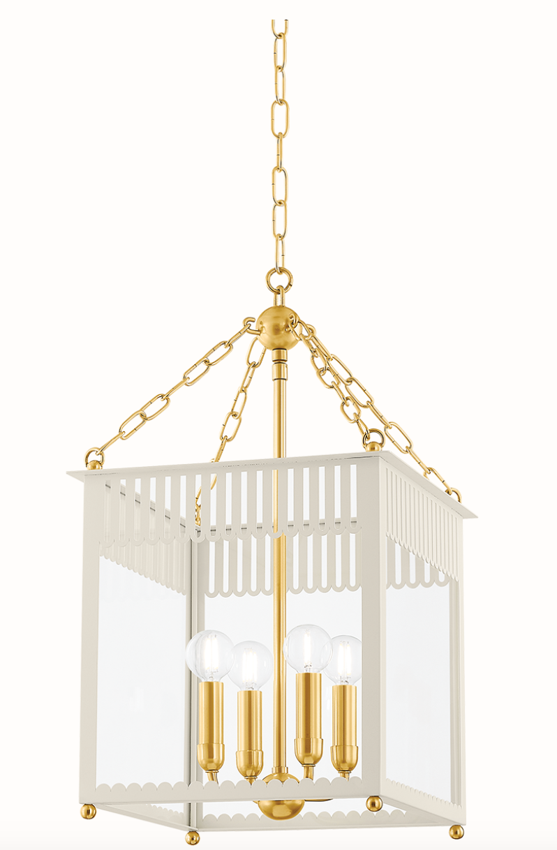 Regular price $880.00Embracing the grand millennial trend, Rosalie presents a fresh take on a traditional box lantern. Scalloped and slatted details elevate the clean lines of this 4-light fixture. Additional decorative elements, like the Aged Brass sphere and delicate chainwork, add to the playful composition. Rosalie is available in two sizes and two colors, Soft Cream or Soft Arctic Blue.